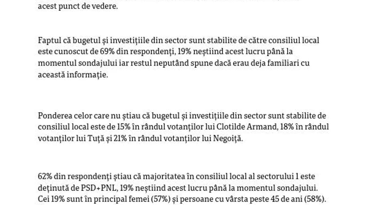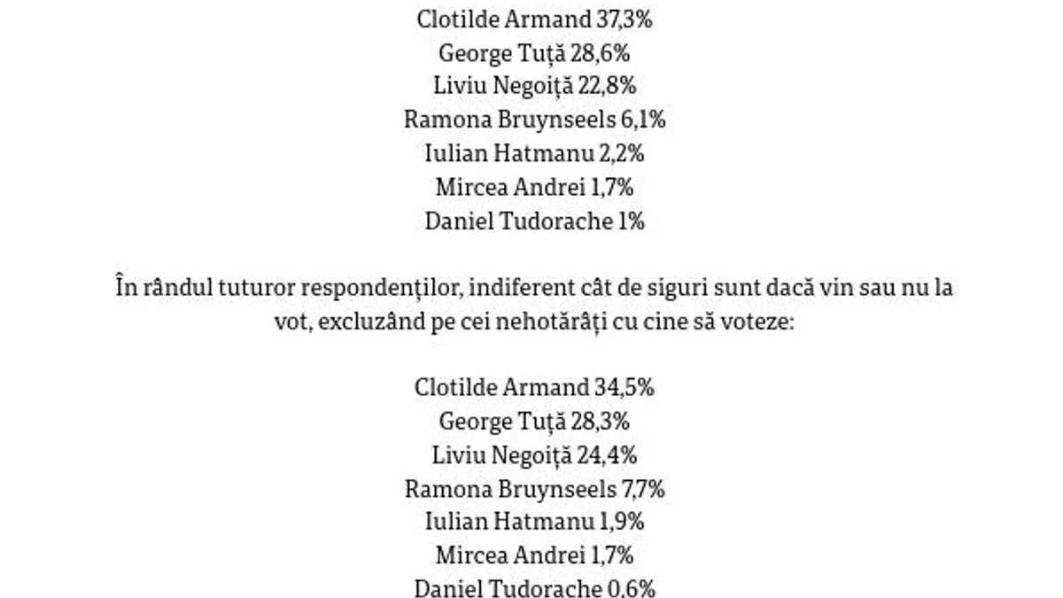 Dacă se iau în considerare doar respondeții care merg sigur la vot, Armand ar colecta 37,3% din voturi, Tuță- peste 28%, iar Negoiță - 22,8%.
