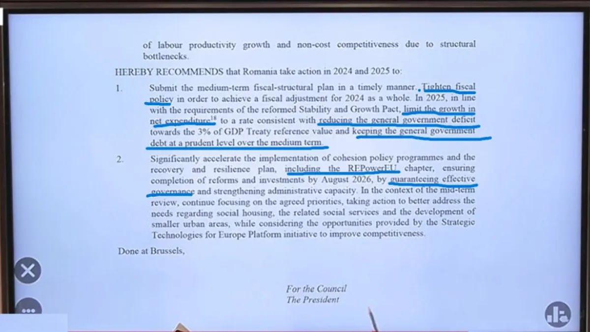 În documentul prezentat de Antena 3 se cere României să înceapă din 2024 reducerea deficitului bugetar la doar 3%, printr-o politică fiscală strânsă. Însă, în legătură cu anul 2025, Comisia Europeană scrie clar că Guvernul trebuie să reducă cheltuielile, nu să majoreze taxele.
