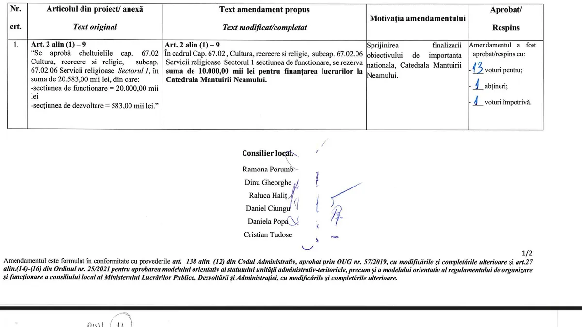 Consilierii PSD-PNL din Sectorul 1 au deturnat zece milioane de lei din bugetul local către Catedrala Neamului, a anunțat primarul sectorului, Clotilde Armand, pe Facebook. Amendamentul a fost depus în ședința de consiliu și aprobat cu o majoritate zdrobitoare.
