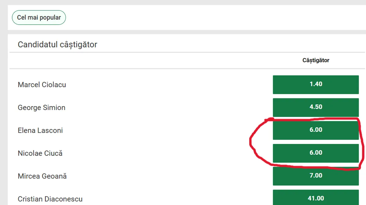Cotele la pariuri politice: la o casă de pariuri, Nicolae Ciucă (PNL) este favoritul numărul II, la o alta George Simion (AUR), urmat de liderul liberal și de Elena Lasconi (USR). Și la una, și la cealaltă, Marcel Ciolacu (PSD) este cotat cu prima șansă la alegerile prezidențiale.