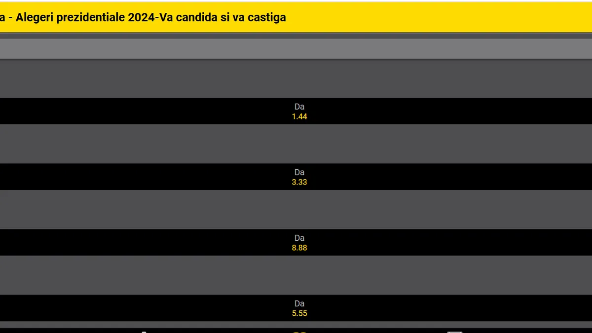 Dacă formula pariului se schimbă, „Va candida și câștiga alegerile prezidențiale”, cotele sunt: Ciolacu - 1,44 (șanse ceva mai mici decât la prima întrebare), Ciucă - 3,33, Lasconi- 5,55, Simion - 7,77 și Geoană - 8,88.