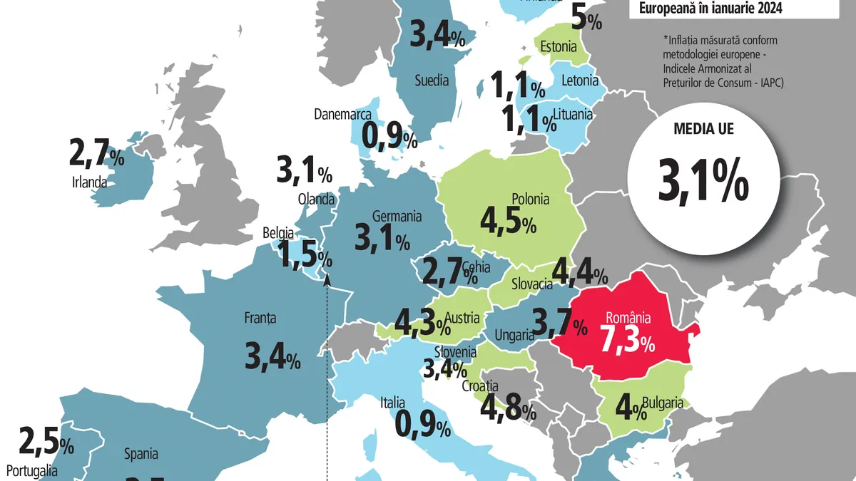 - România are o inflație de 7,3%, cu două procente mai mare decât în următoarea ţară clasată, Estonia. Media inflației în UE a fost de 3,1%. „Motivul creşterii inflaţiei este reprezentat de modificările fiscale, care au intrat în vigoare de la 1 ianuarie 2024 şi au propulsat preţurile”, scrie Ziarul Financiar. În Republica Moldova, inflaţia a scăzut până la 4,2% în decembrie 2023.