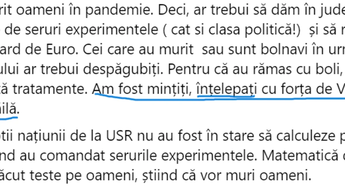 Au murit oameni în pandemie. Deci, ar trebui să dăm în judecată firmele de seruri experimentele ( cat si clasa politică!) și să recuperăm un miliard de Euro. Cei care au murit sau sunt bolnavi în urma vaccinului ar trebui despăgubiți. Pentru că au rămas cu boli, care necesită tratamente. Am fost mințiți, înțelepați cu forța de Voiculescu și Mihăilă”.