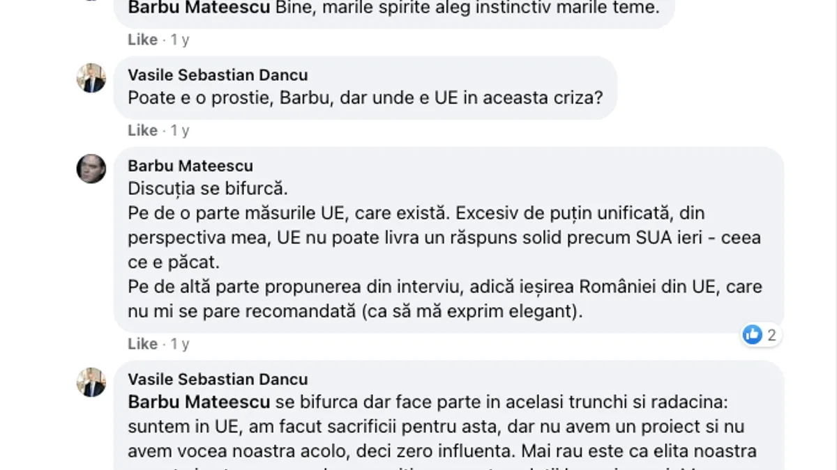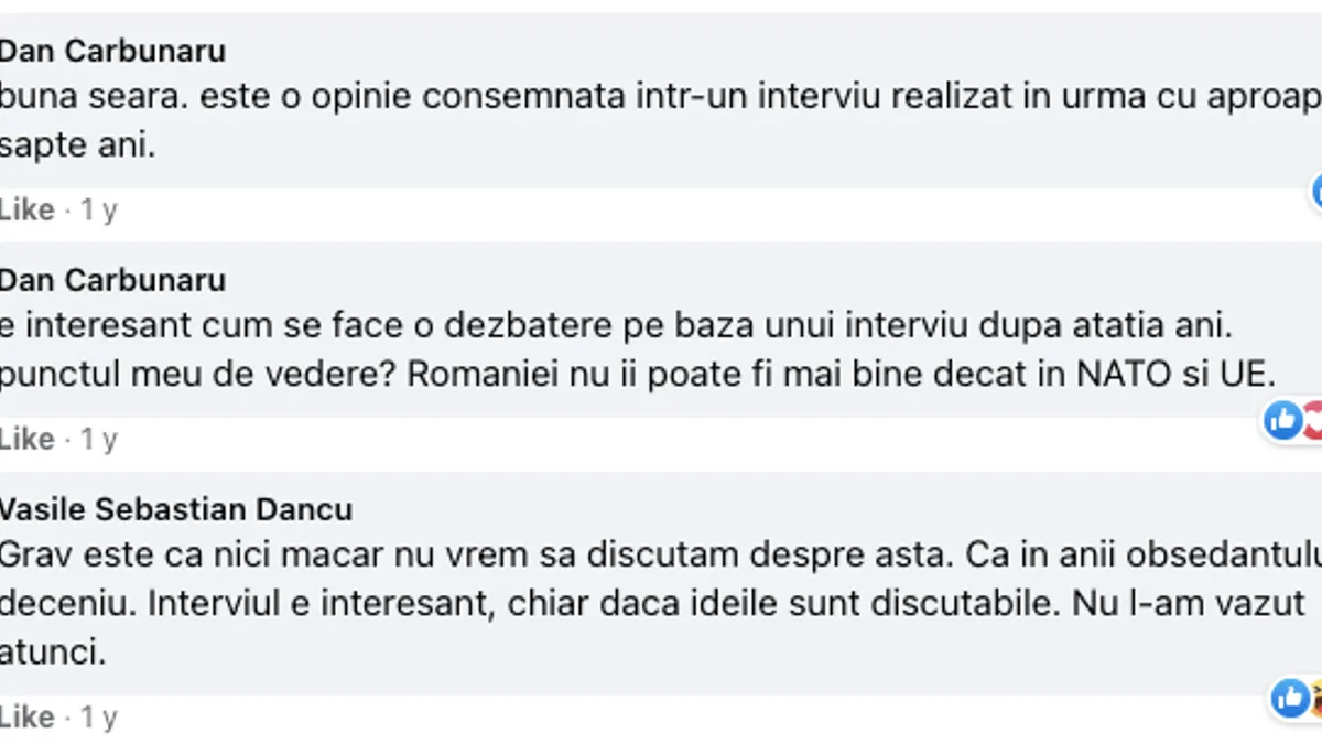 În subsolul postării, Dan Cărbunaru a comentat pe subiect: „e interesant cum se face o dezbatere pe baza unui interviu dupa atatia ani. punctul meu de vedere? Romaniei nu ii poate fi mai bine decat in NATO si UE.”