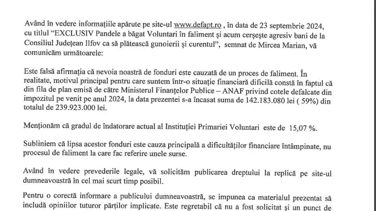 Pandele promite că va returna „împrumutul” de la CJ Ilfov în termen de șase luni. El se plânge că trebuia să încaseze, în 2024, circa 240 de milioane de lei din „cotele defalcate din impozitul pe venit”, dar a atras doar 142 de milioane de lei până la 18 septembrie.