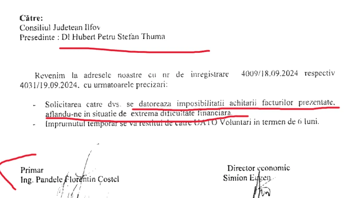 În scrisoarea către Consiliul Județean Ilfov, primarul Pandele afirmă că localitatea pe care o administrează se află „în situație de extremă dificultate financiară”.