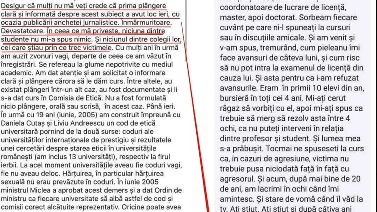 Aproape imediat, o fostă studentă, Claudia Radu, i-a răspuns, amintindu-i că ea i-a spus că Pieleanu îi face avansuri de câteva luni, dar Miroiu i-a spus că nu poate interveni în relația student-profesor.