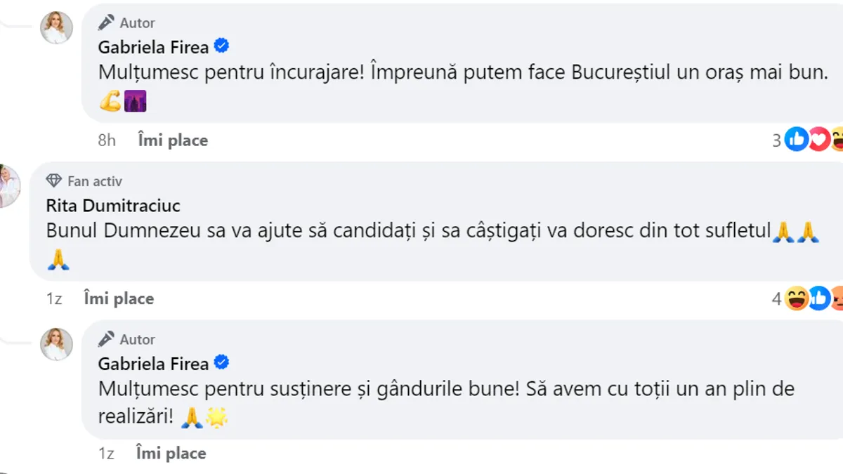 Gabriela Firea se autopropune primar, pe Facebook: „Trebuie omul potrivit la locul potrivit”, a scris ea, într-un comentariu adăugat la propria postare. Spre deosebire de alte postări, care strâng mii de like-uri, aceasta avea sub 300, la ora redactării acestei știri, la mai mult de o zi de la publicare.