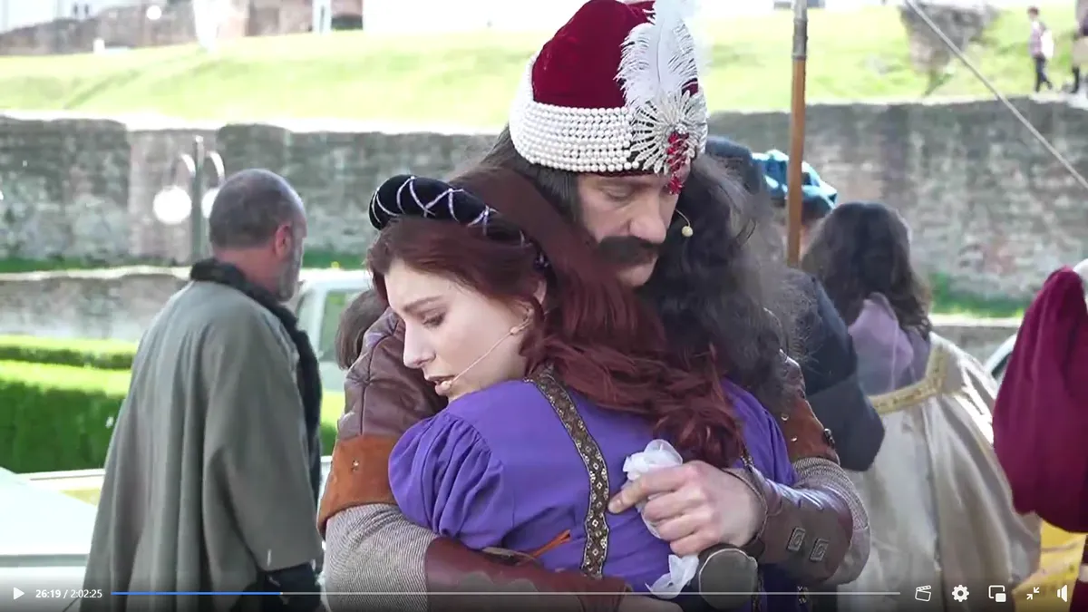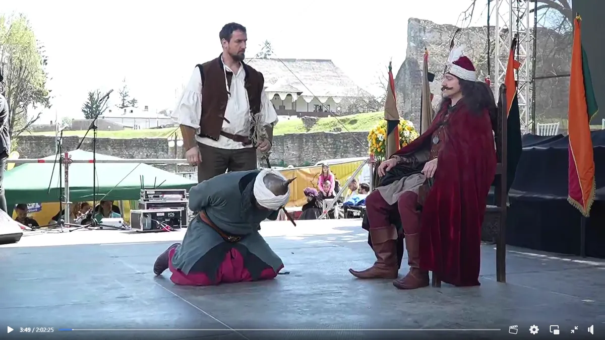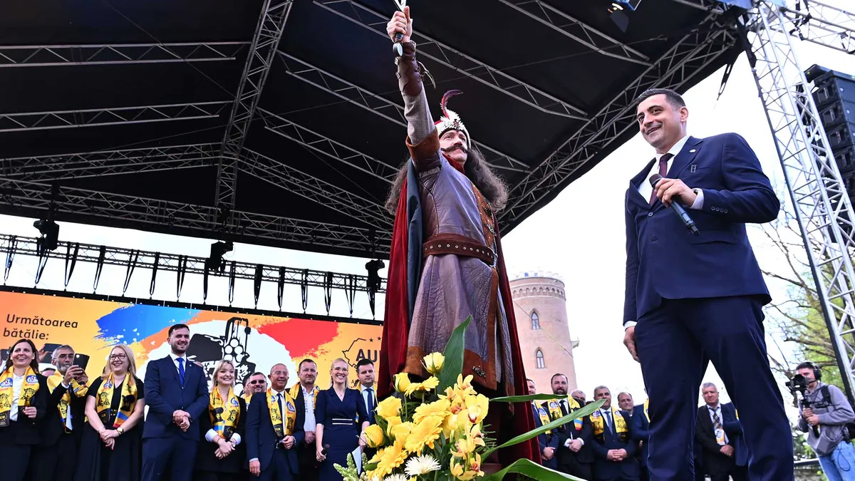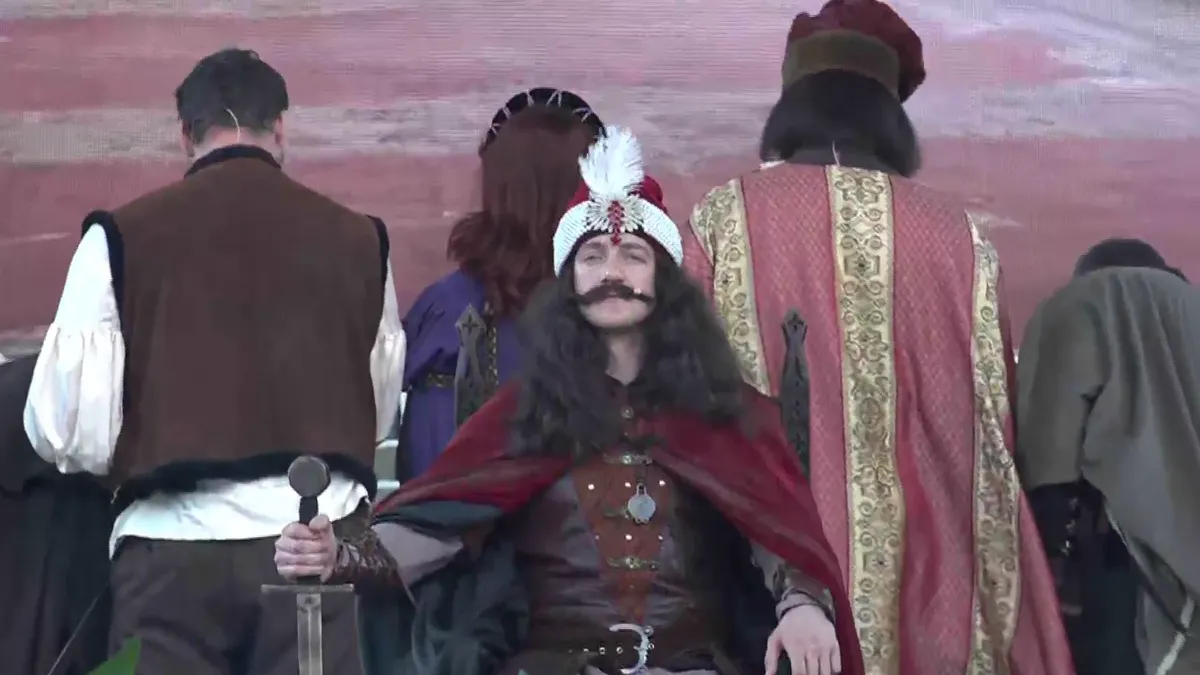 Circ istoric la lansarea candidaților AUR la Parlamentul Europeanla Târgoviște: participanții la miting au avut parte de o scenetă de circa 30 de minute cu Vlad Țepeș, un turc care lua bătaie și o domniță în albastru. La final, președintele AUR, George Simion, și-a făcut poze alături de Vlad Țepeș.
