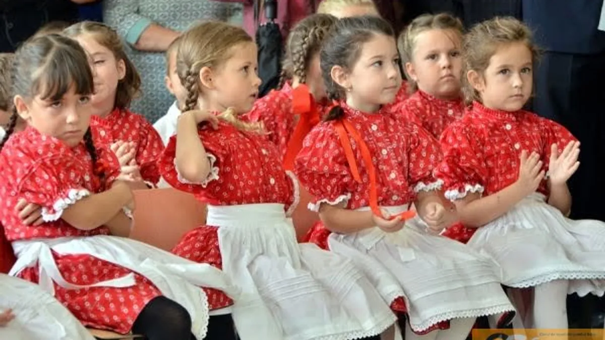 Un pluton de tăietori de panglici, cu Kelemen Hunor în frunte, plus trei preoți, s-au înghesuit, sâmbătă, la inaugurarea unei grădinițe dintr-un sat din Sălaj, Crasna. Fotografiile surprind politicienii înghesuindu-se să taie panglica, în timp ce copiii sunt aliniați, în costume naționale, cu ie și clop.