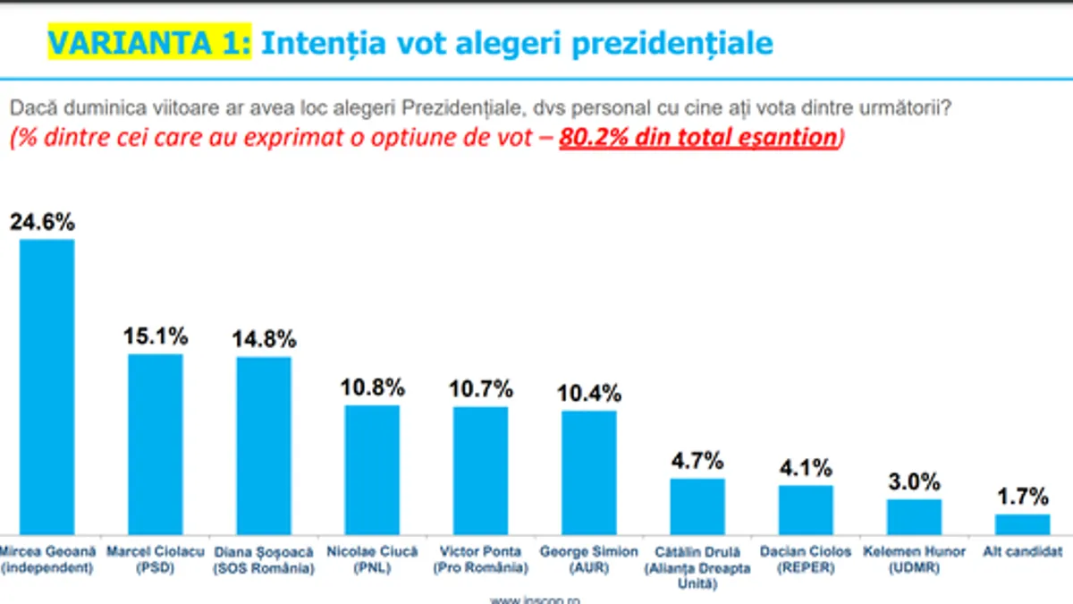 Față de sondajul realizat în ianuarie de INSCOP, Geoană are o ușoară scădere, președintele PSD, Marcel Ciolacu, a crescut cu trei procente, iar liderul liberal cu doar 0,7%.