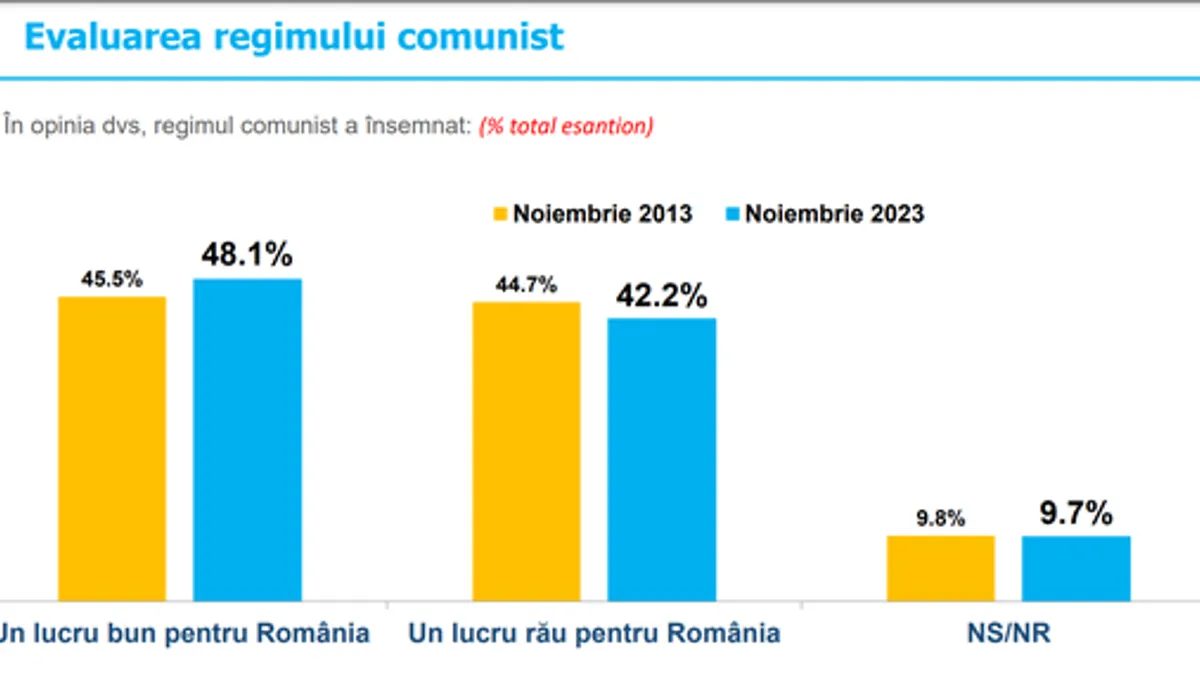În opinia a 48.1% dintre români, regimul comunist a însemnat un lucru bun pentru România (faţă de 45.5% în noiembrie 2013), în timp ce 42.3% sunt de părerea contrară (faţă de 44.7% în noiembrie 2013). Nu ştiu sau nu răspund la această întrebare 9.7% dintre cei chestionaţi (faţă de 9.7% în noiembrie 2013).