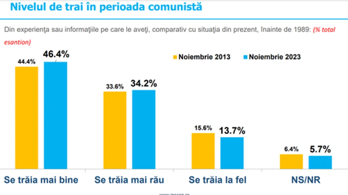 46.4% dintre români cred că înainte de 1989 se trăia mai bine comparativ cu situaţia din prezent (faţă de 44.4% în noiembrie 2013), 34.2% că se trăia mai rău (faţă de 33.6% în noiembrie 2013), iar 13.7% că se trăia la fel (faţă de 15.6% în noiembrie 2013). Nu ştiu sau nu răspund 5.7% din total eşantion (faţă de 6.4% în noiembrie 2013).