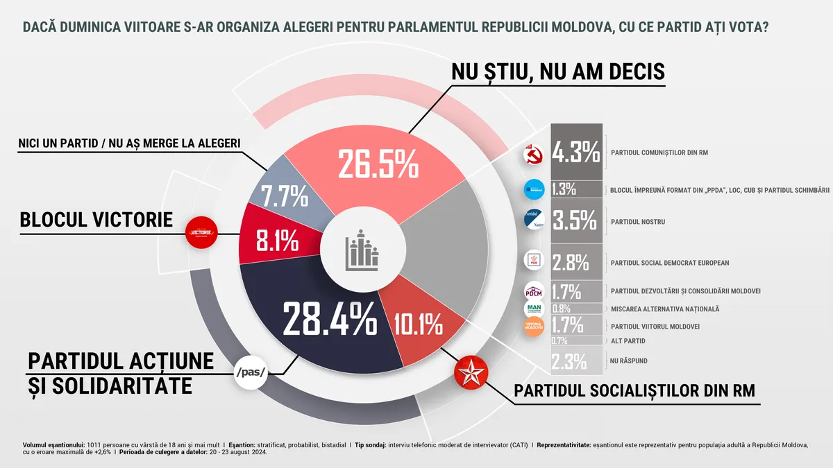 În ceea ce privește intenția de vot la parlamentare - dar aceste alegeri vor avea loc abia în 20225 - pentru formațiunea Maiei Sandu, PAS, ar vota 28,4% dintre cei chestionați, pe locul II fiind socialiști, PSRM, cu o intenție de vot de 10,1%. Însă 26,5% dintre repondenți sunt indeciși.