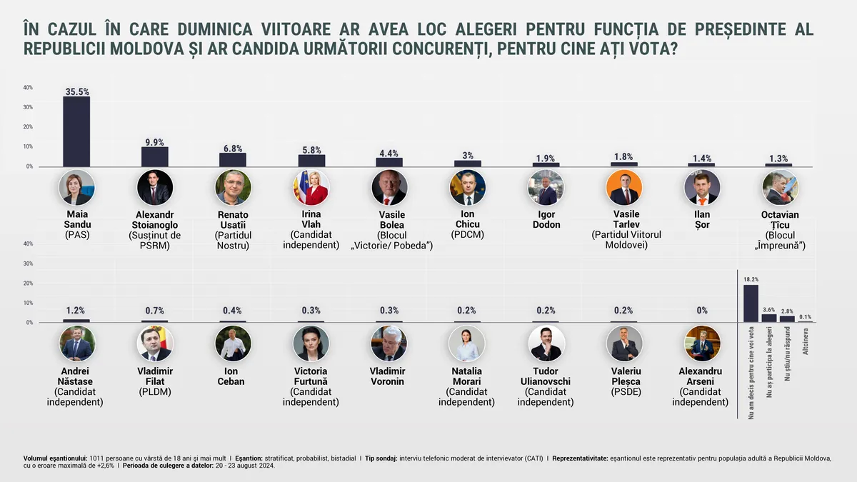 Pe locul II, după Sandu, se află candidatul socialist Alexandr Stoianoglo, fost procuror general al Republicii Moldova. Pe locul III, cu o intenție de vot de doar 6,8% este Renato Usatîi.