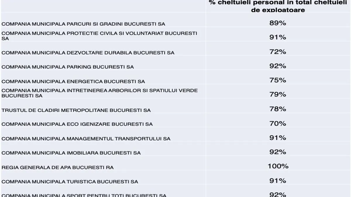 În ianuarie 2020, ministrul Finanțelor, Florin Cîțu, a prezentat o listă cu ponderea cheltuielilor de personal în totalul cheltuielilor de exploatare la companiile municipale înființate de primarul Capitalei, Gabriela Firea, care arată că la 14 firme salariile consumă peste 70% din fonduri, la Regia de Apă sunt de 100%, iar la Societatea de Transport Bucureşti (STB), cheltuielile de personal sunt de 73%.