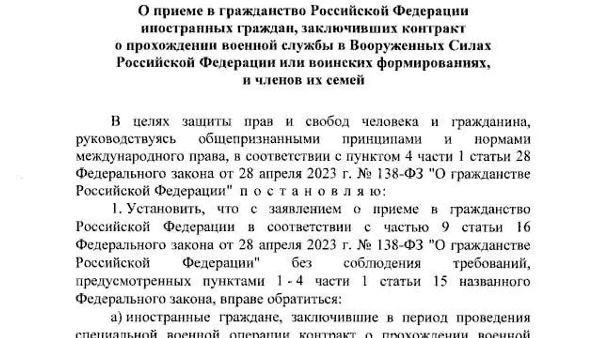 Decretul prevede că persoanele care au semnat contracte în timpul a ceea ce Moscova numeşte „operaţiunea sa militară specială” în Ucraina pot solicita să obţină paşapoarte ruseşti pentru ei înşişi şi pentru soţii, copiii şi părinţii lor. Aceştia trebuie să furnizeze documente care să arate că au semnat contractele pentru o perioadă de cel puţin un an.