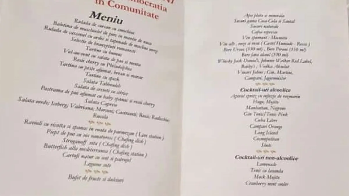 Potrivit meniului oferit participanților la evenimentul „PSD Gheorgheni Social Democrația în Comunitate”, aceștia au avut de ales între 20 feluri de mâncare și un bufet de fructe și dulciuri, opt tipuri de băuturi alcooloce, nouă cocktailuri alcoolice și patru non-alcoolice, la care s-au adăugat sucuri și apă minerală.