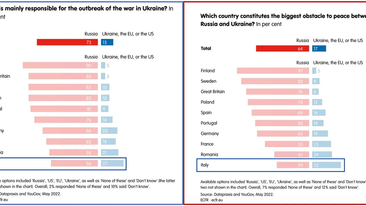 Astfel, 21% dintre români cred că principalul responsabil pentru conflict este „Ucraina, UE sau SUA”, iar 24% consideră că acest grup de state stă în calea păcii, nu Rusia. În Italia, procentele sunt de 27% și, respectiv, 35%.