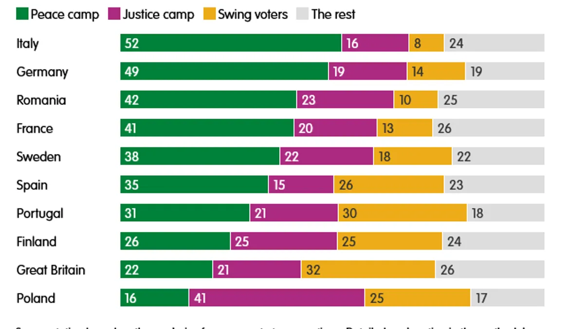 „Cele două țări sunt pe două planete diferite când vine vorba de preferința lor pentru pace sau justiție. După cum s-a menționat, Polonia este singura țară din sondaj în care tabăra Justiției prevalează în mod clar față de tabăra Păcii (41% la 16%). România – alături de Franța, Germania, Italia, Suedia și Spania – manifestă o preferință clară pentru pace față de justiție (42% față de 23%).