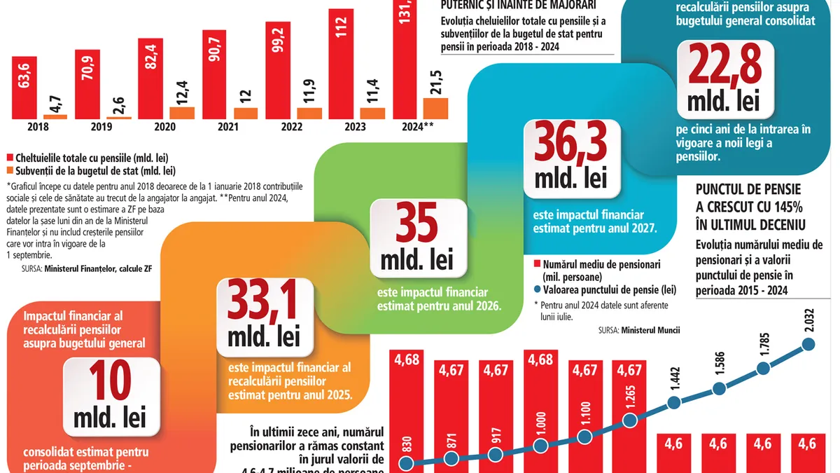 Subvenția de la buget pentru pensii se dublează, ajungând la 21,5 miliarde de lei în 2024, arată calcule făcute de Ziarul Financiar. Potrivit acestei publicații, cheltuielile totale cu pensiile vor fi, în aceste an, de 131,4 miliarde de lei.