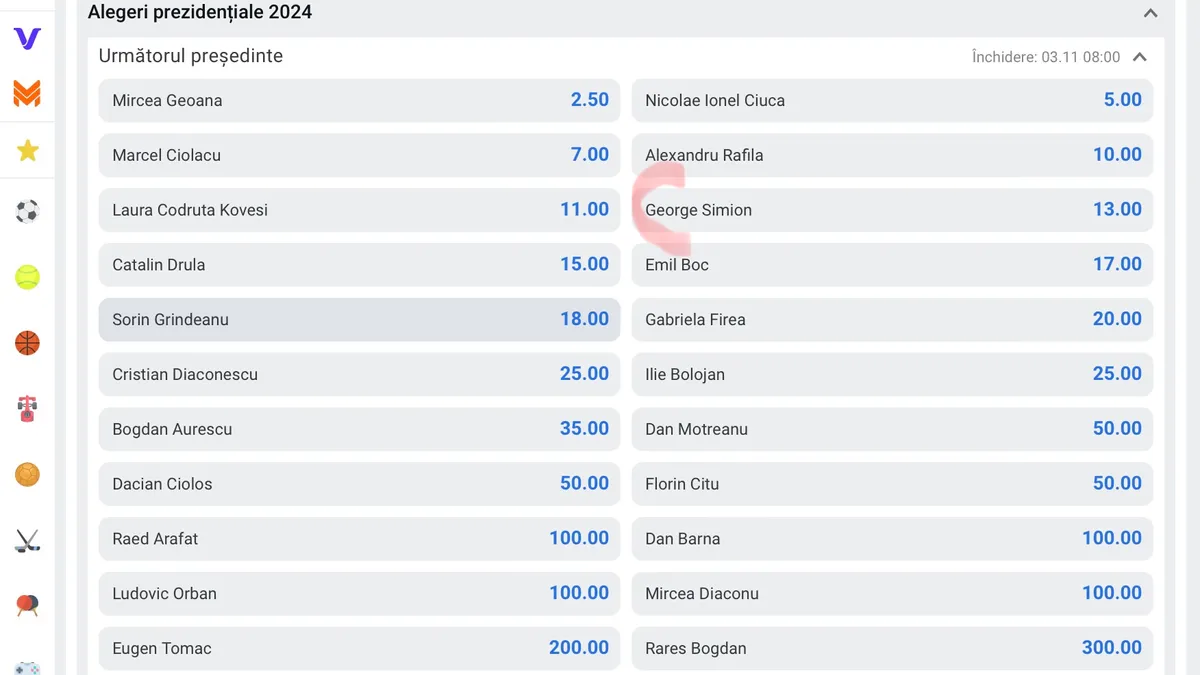 S-au deschis pariurile pentru 2024: o mare casă de pariuri oferă cotele principalilor favoriți în cursa pentru prezidențiale. Lista de pe care pariorii pot alege este extrem de vastă: de la Diana Șoșoacă și Gheorghe Hagi la Mircea Geoană, Nicolae Ciucă sau Laura Codruța Kovesi.
