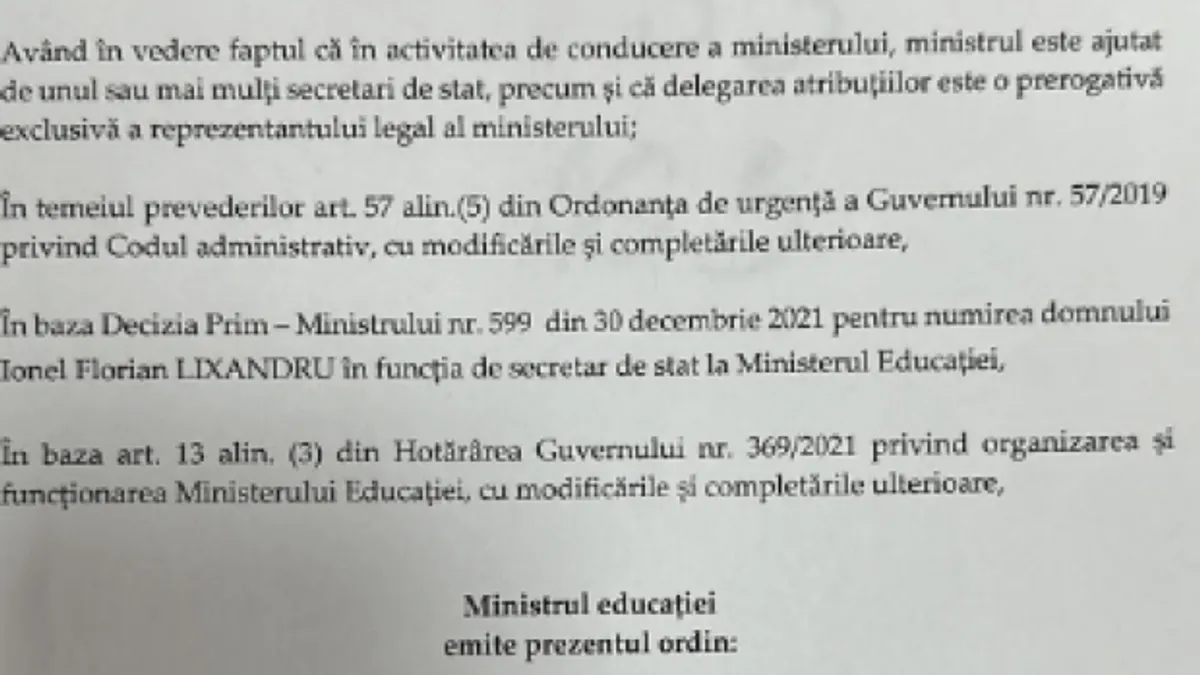 „Începând cu data prezentului ordin se abrogă Ordinul nr 6.46/04.10.2022 privind delegarea unor atribuţii domnului secretar de stat Ionel Florian Lixandru”, prevede ordinul de ministru din 1 februarie.