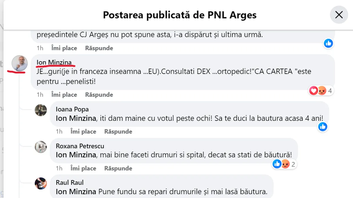 Mînzină, care conduce PSD Argeș, este președinte al Consiliului Județean și candidează pentru un nou mandat, a scris, pe pagina de Facebook a organizației liberale din Argeș: „JE...guri(je in franceza inseamna ...EU). Consultati DEX ...ortopedic!"CA CARTEA "este pentru ...penelisti!”.