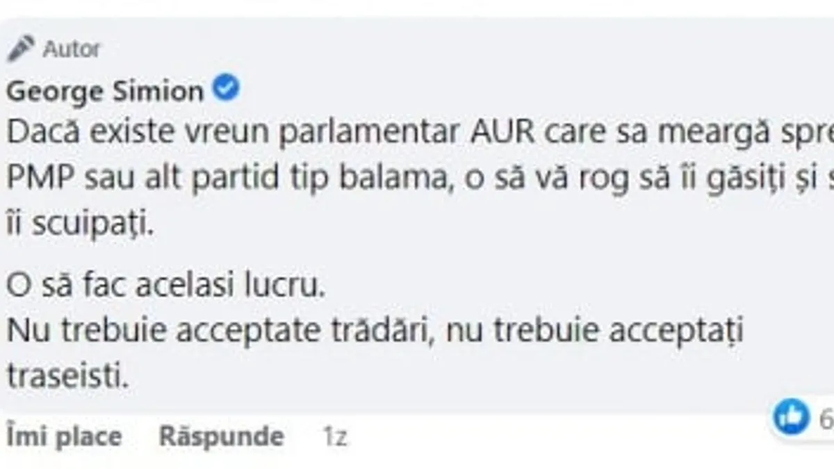 „Dacă există vreun parlamentar AUR care sa meargă spre PMP sau alt partid tip balama, o să vă rog să îi găsiți și să îi scuipați”, a scris Simion pe pagina lui de socializare.
