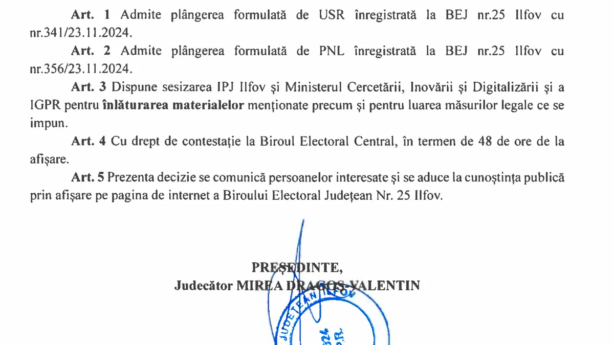 Biroul Electoral Ilfov a admis ambele sesizări și a sesizat atât Poliția, cât și Ministerul Digitalizării, cărora le-a cerut să ia măsuri pentru ca postarea să fie înlăturată.