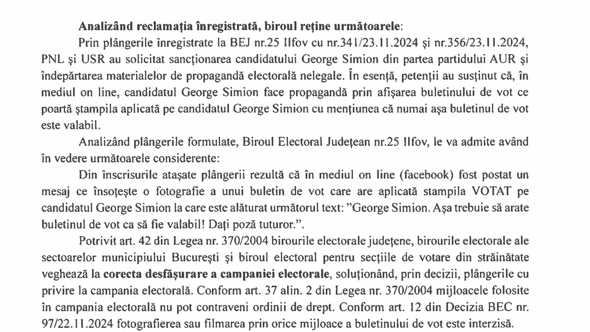 Biroul Electoral Ilfov cere Poliției îndepărtarea de pe Facebook a postării lui George Simion în care apare un buletin de vot care are ștampila "VOTAT" pe liderul AUR