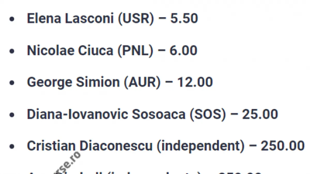 Site-ul Betano a desființat, brusc, pariurile la prezidențialele, după ce Ciolacu lua bătaie constant. În septembrie, site-ul oferea pariorilor posibilitatea să mizeze pe candidații la alegerile din România. În octombrie, se mai putea paria pe candidații din SUA și Canada.