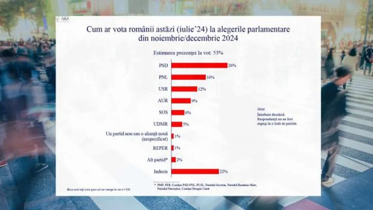 În ceea ce privește alegerile parlamentare, 26% dintre respondenți au declarat că ar vota cu PSD, 16% cu PNL, iar 12% cu USR. AUR ar câștiga 9% din voturi, SOS - 6%, iar UDMR - 5%.
