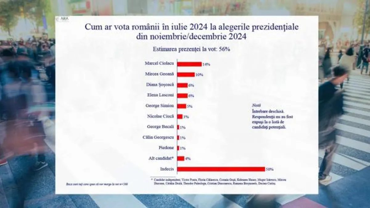 Potrivit răspunsurilor, Ciolacu ar obține 14% din voturi, în timp ce actualul secretar general adjunct al NATO ar câștiga 10% din voturi. Diana Șoșoacă și Elena Lasconi ar fi pe 3, la egalitate, cu 6%, iar pe următoarele locuri se află George Simion (5%) și Nicolae Ciucă (3%).