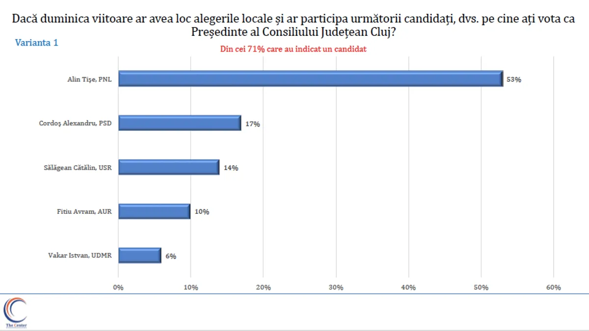 La Consiliul Județean, Alin Tișe (PNL) ar câștiga fără emoții, cu un scor de 52-53%, în funcție de contracandidații săi.