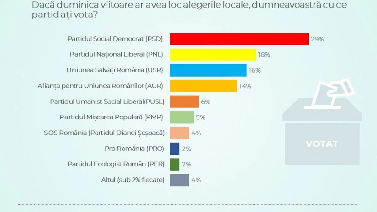 În ceea ce privește intenția de vot a bucureștenilor, CURS susține că situația se prezintă astfel: PSD- 29%, PNL- 18%, USR - 16%, AUR - 14%, PPUSL (formațiunea lui Dan Voiculescu și Popescu Piedone) - 6%, iar PMP - 5%.