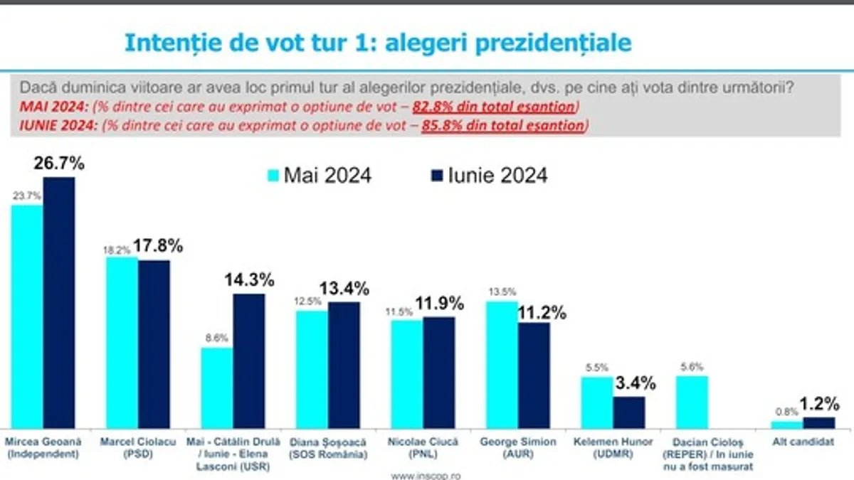 Astfel, intenția de vot pentru Lasconi este de 14,3%, iar cea pentru Drulă era, în mai, de 8,6%.