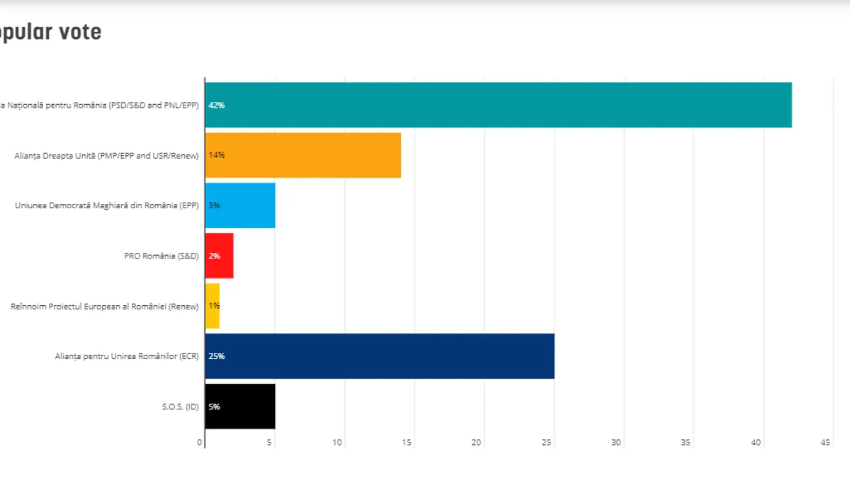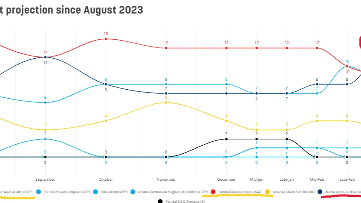 Între timp, popularitatea marii coaliții formate din Partidul Social Democrat (PSD/S&D) și Partidul Național Liberal de centru-dreapta (PNL/PPE) a continuat să scadă în urma scandalurilor de corupție. Se preconizează că PSD va coborî pe locul al doilea, cu nouă locuri, urmat de PNL cu opt”, explică Euractiv.