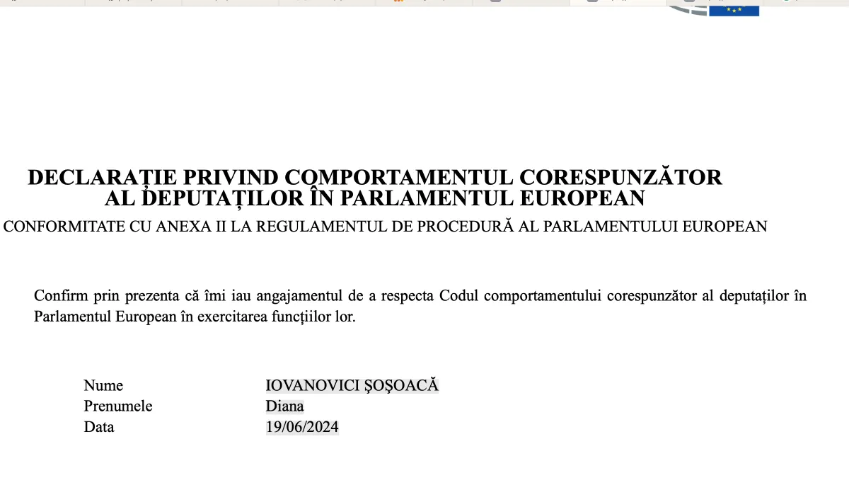 Președintele SOS România, Diana Șoșoacă a declarat, în scris, că se va purta frumos, la Bruxelles: “Îmi iau angajamentul de a respecta Codul comportamentului corespunzător al deputaților în Parlamentul European în exercitarea funcțiilor lor“, se arată în documentul public, de pe pagina ei de pe site-ul Parlamentului European.