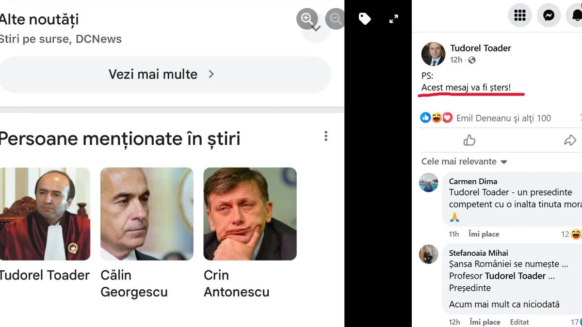 Duminică seară, un alt mesaj pe Facebook, care urma să fie șters, prezenta o captură de ecran dion care reieșea că numele cel mai frecvent căutate în aceste zile sunt cele ale lui Tudorel Toader, Călin Georgescu și Crin Antonescu.
