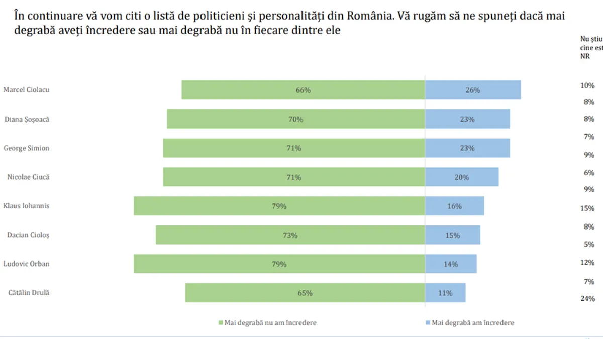 Marcel Ciolacu este politicianul cu cea mai mare cotă de încredere, 26%, urmat de Diana Şoşoacă şi de George Simion, fiecare cu 23%. Preşedintele Klaus Iohannis are 16% cotă de încredere, dar are cel mai mare procent de persoane care declară că mai degrabă nu au încredere în el.
