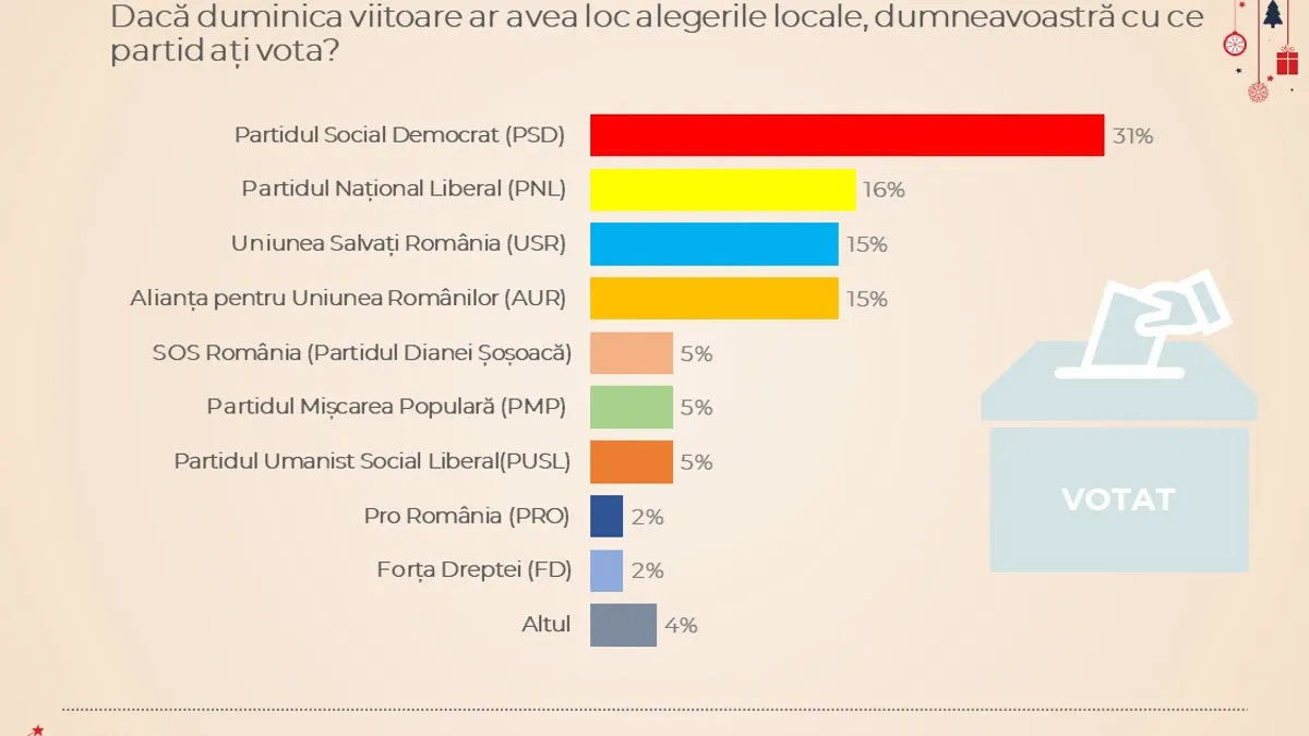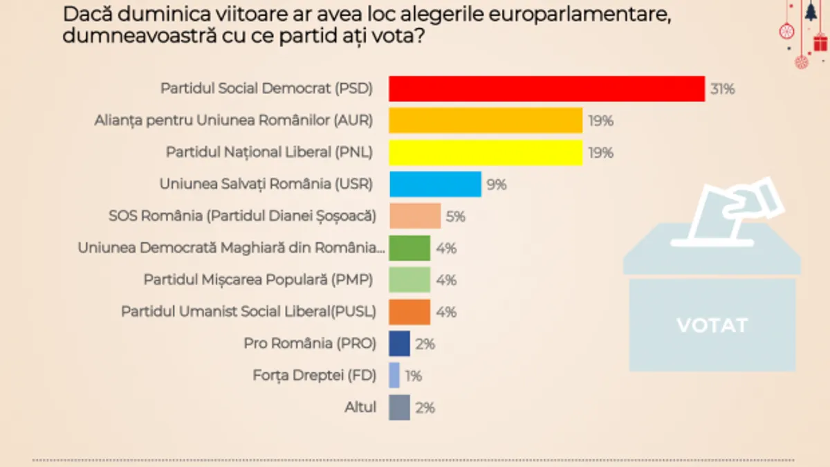 Sondajul CURS, publicat azi, mai arată că PSD ar obține 31% din voturi, PNL și AUR ar atrage circa 19% din electorat, SOS România - 5%, iar UDMR - 4%.