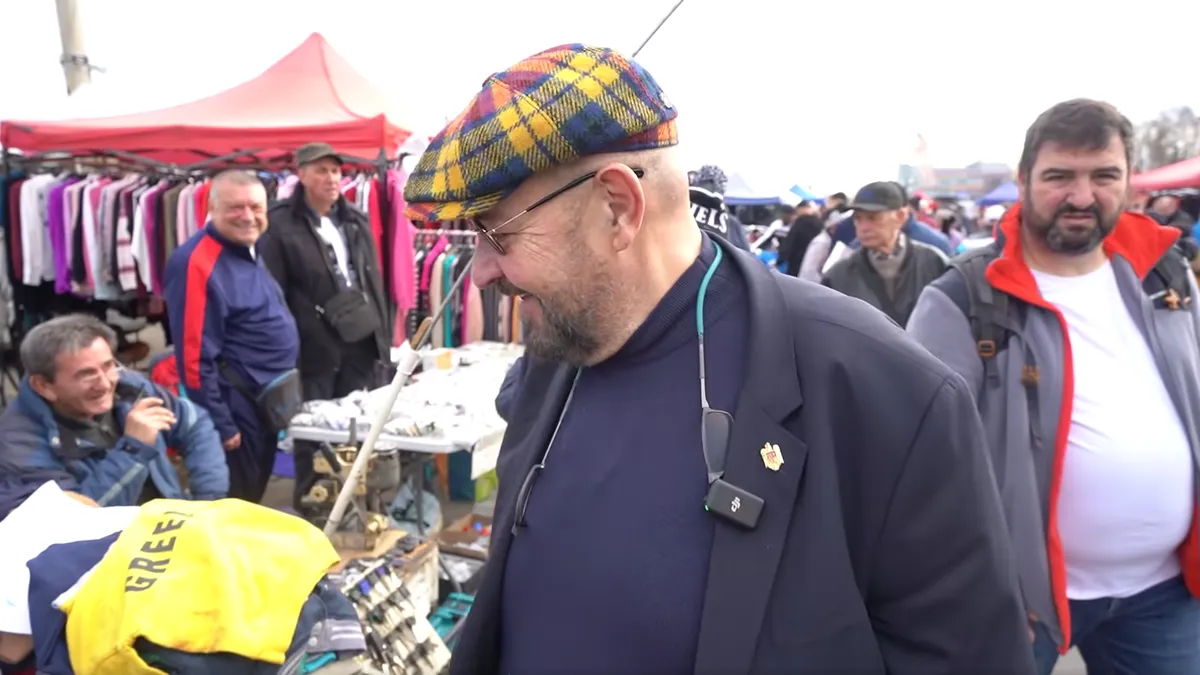 VIDEO+FOTO Filmare grotescă cu Piedone luând o gustare „câmpenească ardelenească” într-un târg de haine dubioase, parfumuri la litru și alcool ieftin